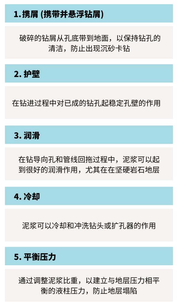 水平定向鉆施工用泥漿的作用主要有五個(gè):攜屑、護(hù)壁、潤(rùn)滑、冷卻、平衡壓力。